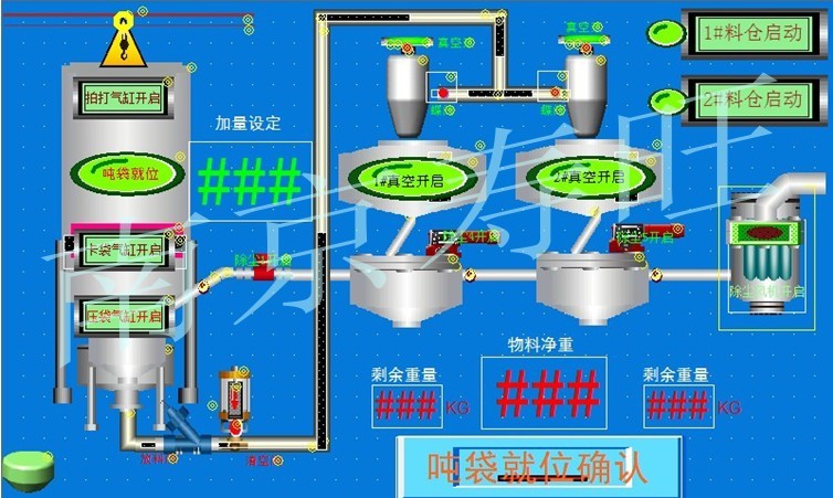 此控制系統(tǒng)為:噸袋卸料站+計(jì)量+輸送+除塵為一體的自動(dòng)化設(shè)計(jì)方案。